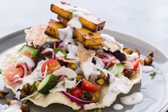 - Put one poppadom on each of four plates and top with the tomato salad. Scatter the chickpeas and naan bread over the salad, then top with the paneer and a large spoonful of the yogurt mixture. Sprinkle with a few mint leaves and serve