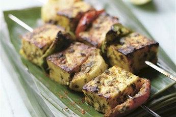 3. Heat a lightly oiled griddle pan or fire up the barbecue until good and hot. Thread each of your skewers with 3 pieces of paneer, 1 piece of onion and 1 piece of each colour of pepper, alternating between paneer and vegetables. Place on the griddle or barbecue and cook for 20 minutes, until slightly charred, turning them every 4-5 minutes to ensure they are cooked evenly on each side.