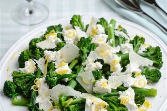 - Put the hot Tenderstem onto plates and dot ricotta over the top. Sprinkle on the zest and spoon on some lemon juice. Scatter the parmesan over each serving. Drizzle with the olive oil, sprinkle with salt, grind on some black pepper and serve.