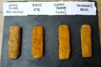 Jamie’s, which proudly proclaims “not an orange breadcrumb in sight!” on its packaging, is certainly the palest out of the bunch and looks more like a goujon – although it is still rectangular. They held their shape the best, and tasted the most natural. Birds Eye’s fingers were the brightest orange but are without artificial flavourings, colourings or preservatives. Its distinctive shade, and slightly spiced crumb, is down to a mixture of paprika, salt and turmeric. Ocean Trader and Sainsbury’s Basic fall somewhere in the middle but again are both free from nasty artificial additives. Ocean Trader, which tasted perfectly nice but had a slightly chewy crumb, again uses paprika, turmeric and pepper, while Sainsbury’s, which were surprisingly good, gets their colour from turmeric and capsanthin, which derives from red chillies. The main difference we could tell is the amount of fish per finger: Jamie’s and Ocean Trader are 30g each, while Sainsbury’s and Birds Eye are 25g each. Neither Lidl or Sainsbury’s could tell me how they produce their products for such a reduced price. All of them though, believe it or not, are made using fillets of fish, rather than minced fish.