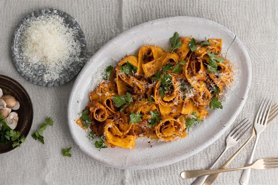 While wild boar ragù with pappardelle is popular in Italy, you could happily substitute pork shoulder in this recipe. The meat is cooked low and slow in red wine, tomatoes, herbs, vegetables and spices for an incredibly flavourful end result. It also freezes really well, should you have any leftovers.