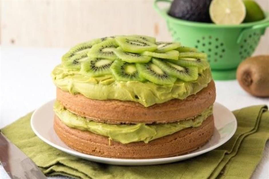 This unusual-looking layer cake features a rather unexpected ingredient: avocado. Don’t dismiss the idea until you’ve tried it, though – the fruit adds a rich, creamy sweetness to the icing (as well as a splash of colour). The vegan sponge, meanwhile, makes clever use of apple cider vinegar and almond milk, which adds moisture. Sliced kiwis are the ideal topping for this fruity little number.