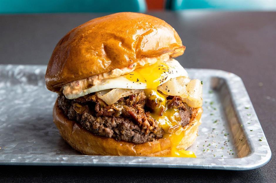 Pappas prides itself on serving 'Texas-sized burgers for real appetites' – so come hungry if you're ordering one of its massive 10oz burgers, all of which come with a side of fries. One of the best on the menu is the Lucy Juicy, the retro joint's take on Minnesota's cheese-stuffed specialty (the Juicy or Jucy Lucy). Pappas' Lucy Juicy features a tender beef patty packed with melty American cheese, served on a challah bun with bacon jam, pimento cheese, grilled onions, and a fried egg. It's quite a mouthful.