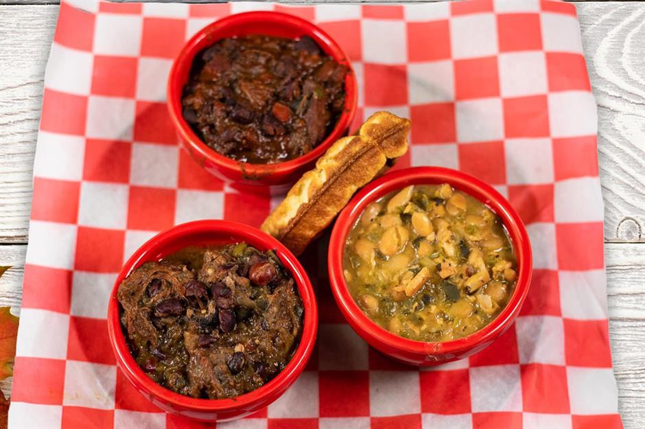 Dr Rolf's Barbeque has a trio of delicious chilis on offer – and, happily, you don't have to choose between them. Order the chili flight, and you'll get all three: that's white (smoky chicken and beans), green (pulled pork and black beans), and red (smoked brisket, black beans, and pinto beans), plus a cornbread waffle or corn chips on the side.