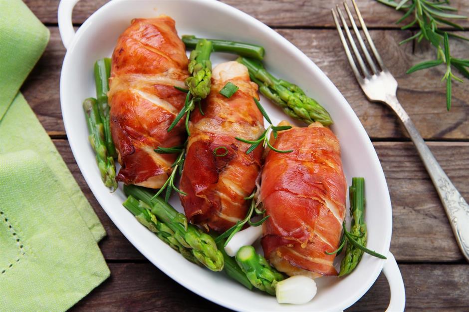 There's a lot to love about this elegant yet simple dish. Chicken breasts are stuffed with mozzarella and basil, wrapped in Parma Ham, then roasted until crispy on the outside and wonderfully juicy on the inside (thanks to all that melted cheese). The potatoes are roasted in the same tin as the chicken – meaning there's less washing up to do afterwards – and ripe cherry tomatoes are added towards the end of cooking time. The whole dish is ready in an hour.