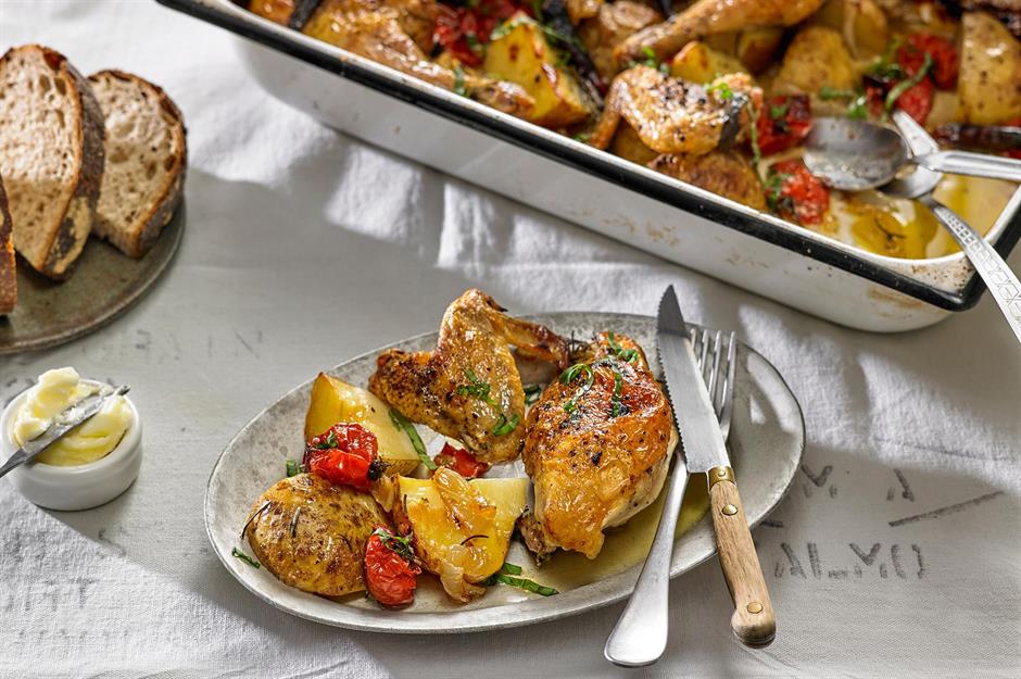 Get the recipe for Mediterranean roast chicken, potatoes and peppers here
