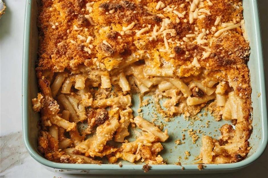 A smart way to sneak vegetables into macaroni cheese, this recipe first sees squash roasted in olive oil and thyme to bring out its sweetness, before being stirred through the cooked macaroni and sauce. Do take care not to overcrowd the baking tray or the squash will steam and turn mushy. To add to the appeal, the cheesy breadcrumb topping gives the dish a lovely crunch.