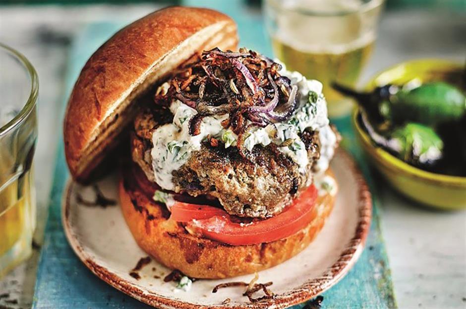 Whether you fire up the barbecue grill or cook these burgers indoors, this recipe deliver a wonderfully tasty spin on a mush-loved classic. The patties are flavoured with garam masala, ginger and garlic for an aromatic finish, while tangles of slightly sweet caramelised onions and creamy roasted chilli yogurt ensure this will be a meal to remember. Serve with a crisp salad and crunchy sweet potato fries for a real treat.