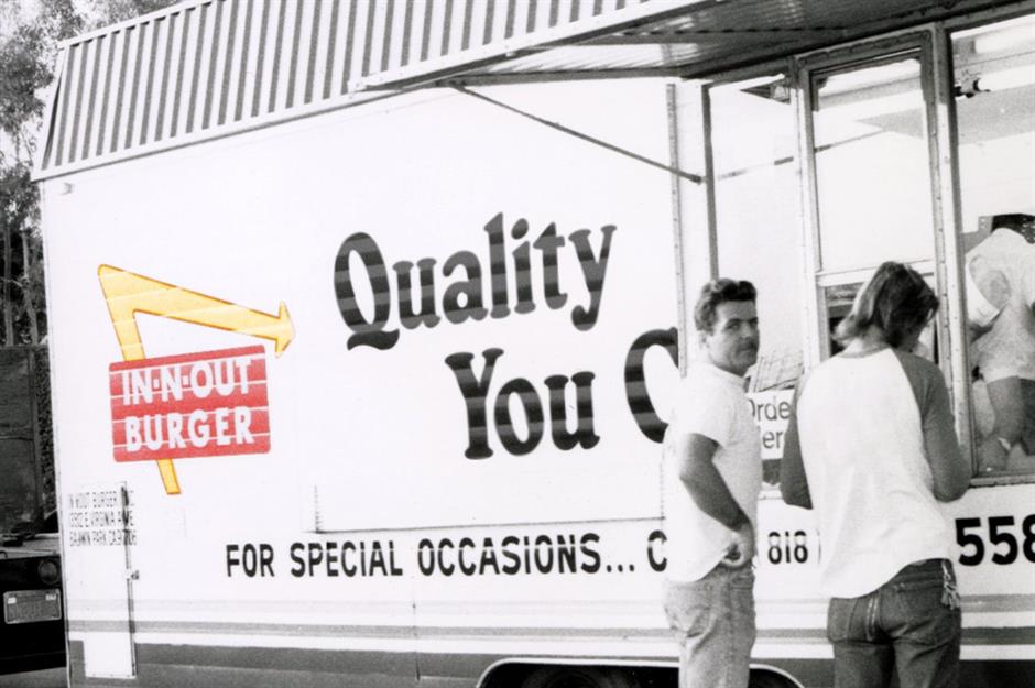 In 1974, the colour of the aprons worn by In-N-Out staff changed from white to red. The easily recognisable dress code also included a paper hat featuring the famous arrow and palm trees for male employees, while female employees continued to sport red and white baseball caps. Customers can request a free hat at any In-N-Out location – it's become a tradition for diners to snap a photo wearing one.