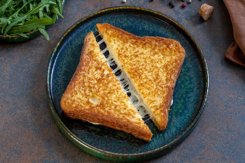 Upgrade your usual grilled cheese sandwich by adding fiery chilli and a mint and coriander chutney. Tip 3.5oz (100g) grated mild Cheddar, 7oz (200g) torn mozzarella, a pinch of chilli powder, a finely chopped tomato and 3 tbsp mint and coriander chutney into a bowl and mix well. Lightly butter one side of eight slices of bread and pile the cheese mix onto four of the slices. Cover with the remaining bread to make four sandwiches. Set a frying pan with a little butter over a medium heat. Cook the sandwiches, in batches, for two or three minutes on each side, until golden. Serve hot with a little extra chutney on the side.