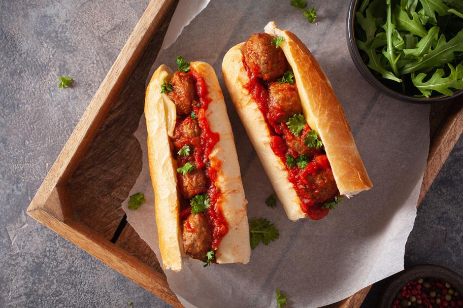 When is it not a good time for a meatball sub? To make four meaty sandwiches, mix 14oz (400g) minced beef, a finely chopped spring onion, a crushed garlic clove, 1 tbsp grated Parmesan, 2 tbsp fresh breadcrumbs, a beaten egg and 1 tbsp freshly chopped basil. Season generously and divide into 12 balls. Bake in a 180°C/350°F/gas mark 4 oven for 20 minutes, or until cooked through.