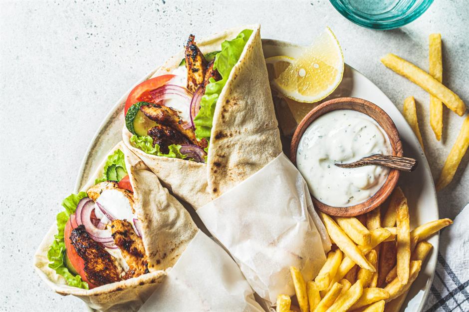 For a veggie-friendly wrap, try some crispy, chewy, pan-seared halloumi. To serve four, cut a 14oz (400g) block of halloumi into slices, then cook in a frying pan over a high heat for two minutes on each side until crisp and golden. Sprinkle with a little dried oregano. Cook a couple of handfuls of French fries according to pack instructions and warm four pitta breads through in the oven. Spread the pitta breads with tzatziki and top with lettuce and sliced tomatoes and onions. Arrange the halloumi on top, along with the French fries. Season with salt and pepper and sprinkle with chopped fresh parsley and a little smoked paprika. Fold the pittas over and around the filling and roll up.