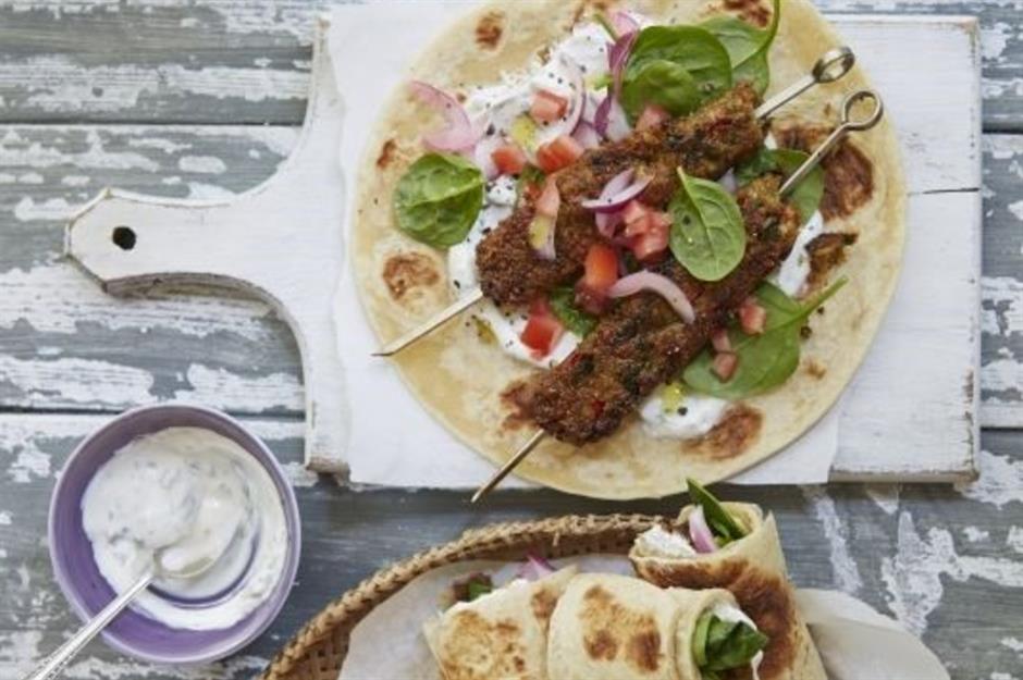 Preheat your grill. Roughly portion the chickpea mix into six and, with slightly oiled hands, form the mix around six metal skewers (you can make these round or slightly flattened). Grill for 10 minutes, carefully turning halfway, or until browned on both sides. Brush the kebabs with melted butter, then quickly ease the kebabs off the sticks. Place straight onto warm flatbreads, top with onions, lettuce and yogurt, wrap up and serve.