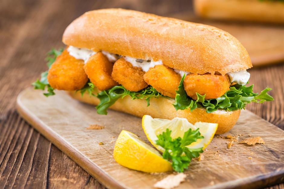 They may not be typical of Louisiana, but trust us, these po’ boys are delicious. To make, simply cook shop-bought wholetail scampi according to pack instructions (around 8oz/220g will serve two generously). Meanwhile, mix 3 tbsp mayonnaise, 1.5 tsp tomato ketchup, 1 tsp Cajun rub, 1.5 tsp hot horseradish, a crushed garlic clove and 1 tbsp pickle juice together. Slice a baguette in half, then split down the middle. Spread with the spicy mayonnaise, pile up with the lettuce leaves, sliced tomatoes and pickled cornichons, then add the scampi and serve.