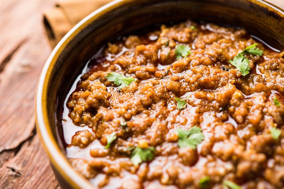 To try this Indian street food favourite at home, fry a small, finely chopped red onion in a little oil until softened. Add 7oz (200g) minced lamb, three grated garlic cloves, ½ tbsp finely grated ginger, a chopped green finger chilli, a small, chopped tomato, 1 tsp ground cumin and ½ tsp garam masala. Bring to a simmer, then cover and cook until the meat is soft and the excess liquid has evaporated, giving the pan an occasional stir and breaking up the meat – this will take 15-20 minutes.