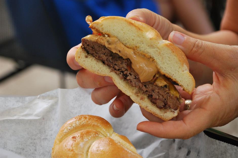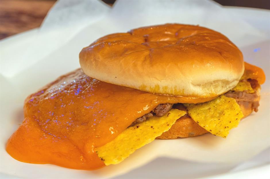 Vegetarians will want to steer clear of this one. Although its name suggests otherwise, the San Antonio bean burger is a mammoth meaty mix of flavours. This Texas-born burger features a juicy beef patty topped with diced onions, Fritos corn chips, refried beans and a processed cheese sauce (usually American brand Cheez Whiz). There is some dispute surrounding its origins, though most burger experts agree it was invented by Frank Sills, owner of the original Sills Snack Shack in San Antonio, Texas, during the 1950s.