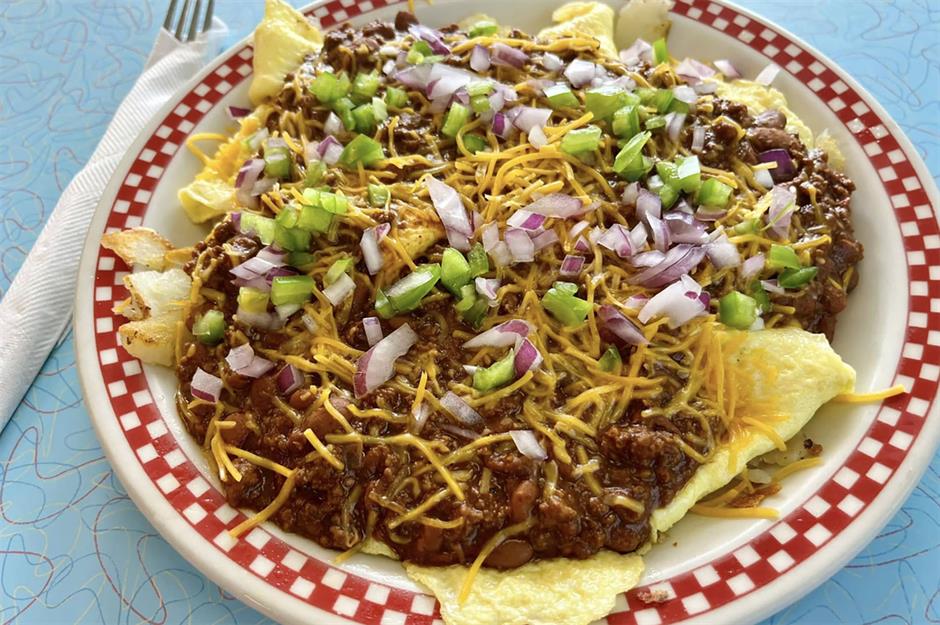 This snug, old-school spot – complete with red seats, booths, and a checkered bar – is a local favorite for breakfasts. All the meat is sourced from Missouri, the portion sizes are huge, and the baked goods are made fresh, in house. Even better, the owner gives meals to those in need and runs regular fundraisers, so you know you’re supporting a place that pays it forward. The signature dish is The Stretch (pictured), a plate of hash browns topped with scrambled eggs, chili, Cheddar cheese, and diced green peppers and onions.