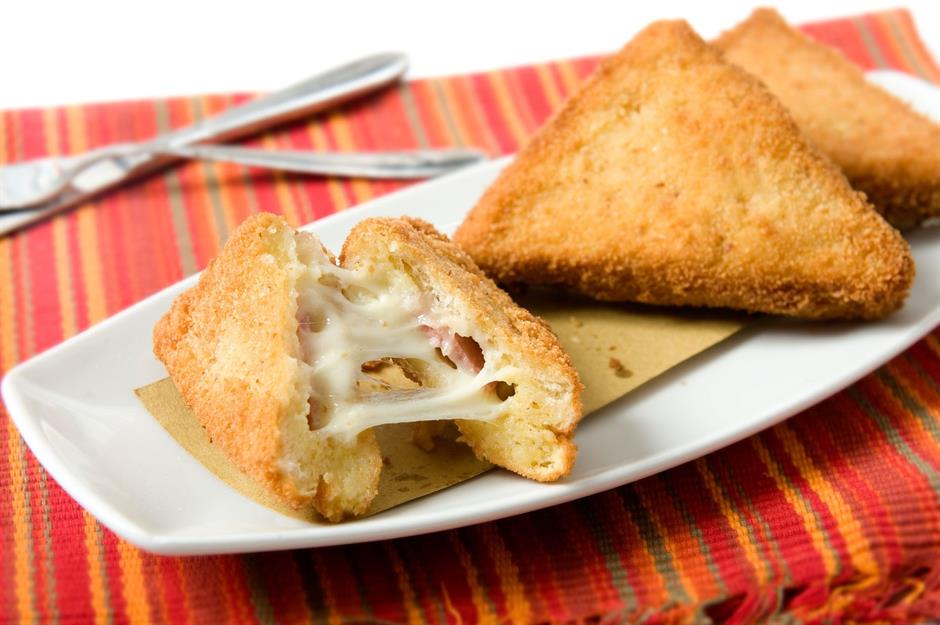 This café and bistro staple takes a classic sandwich filling to higher levels of sophistication. Served warm, it starts with sliced white bread filled with ham and cheese, with Emmental or Gruyère being the usual choice. A layer of creamy béchamel sauce is then added, and the whole thing is dipped in beaten egg before it hits the pan, resulting in a richly indulgent sandwich. The addition of a fried or poached egg on top turns it into a croque madame.
