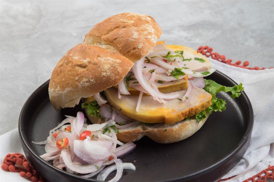This meat-packed meal is an integral part of Peruvian sandwich culture, and for good reason – it's delicious! Its contents vary, but it’s usually made up of jamón del país (peppery country-style ham), salsa criolla (zippy onion and aji pepper relish) and lettuce, all stuffed inside a white, crusty roll. Some like adding slices of radish and chilli, too. It's usually enjoyed for breakfast, and you can find it sold in sandwich shops and food carts across Peru.