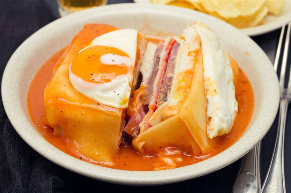A saucy sandwich native to the city of Porto, the Francesinha is one that often divides a crowd. Meat (usually beef or pork), sausage and ham are crammed inside two slices of toasted bread, topped with slices of melted cheese, then slathered with a healthy ladle's worth of rich tomato sauce. It’s often crowned with a fried egg and served with a portion of fries to dip into the sauce. A far cry from the handheld sandwiches many are used to, this is a monster of a dish that requires a knife and fork.