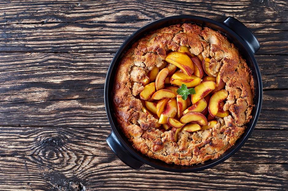 A little like a pie but without the bottom crust, American favourite peach cobbler is a comforting dessert made by layering peaches with a cake, biscuit or pie crust topping. Its origins can be traced back to the early days of America, when European settlers brought fruity dessert recipes to the New World; lacking the equipment and ingredients to make traditional pies, these pioneers improvised by cooking fruit in a pot and topping it with a layer of biscuit dough. It still hits the spot today, served warm, gooey and golden brown with a scoop of ice cream.