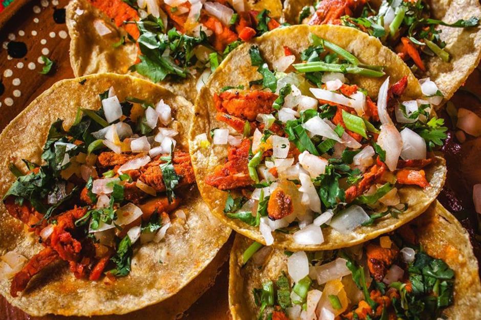 Among the world's most well-known street foods and, for many, something of an obsession, tacos have roots in the Mexican silver mines of the 18th century. Today, the word taco refers to a tortilla that's topped with a variety of fillings, folded, then eaten by hand. The classic carne asada version involves grilled, thinly sliced meats, salsa, onion and guacamole, finished a lime wedge. Toppings vary, with fried fish and mayonnaise popular in Baja. Meanwhile, in Mexico City, tacos de cabeza – tacos filled with steamed offal – are a speciality.