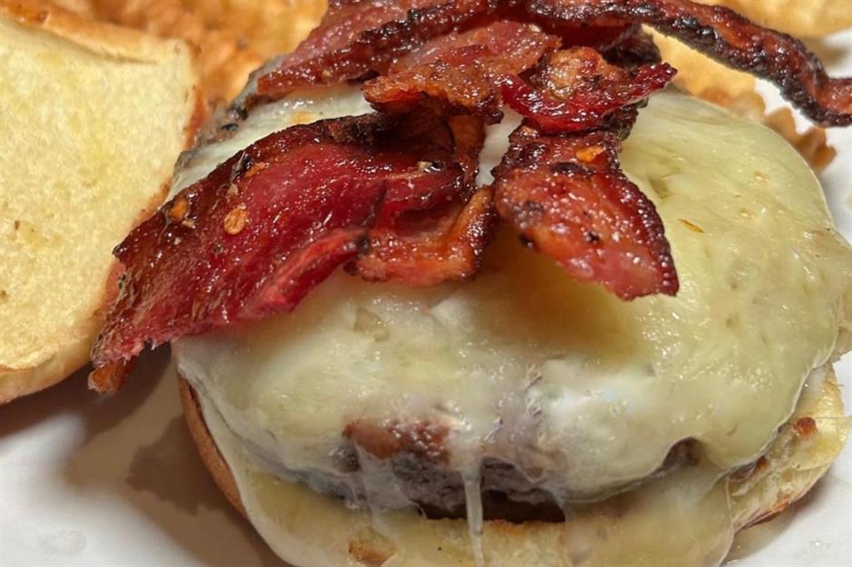 Oklahoma City favorite Bunny’s Onion Burgers may be better known for its juicy fried onion patties, but locals will say you really can’t beat the bacon burger. This mammoth of a creation sees a meaty beef burger topped with Cheddar, grilled onions, fried onion strings, and crispy bacon. It’s all slotted inside a toasted brioche bun and finished with a pickle slice on top. This is far from your average bacon burger.