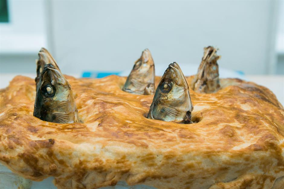 La tarta Stargazy se distingue de todas las demás tartas por las cabezas de pescado (normalmente sardinas o arenques) que sobresalen de la tapa de hojaldre, como si miraran al cielo. Los orígenes de la tarta (que lleva un relleno cremoso de huevo, beicon y patatas) se remontan al pueblo pesquero de Mousehole, en Cornualles, Inglaterra.