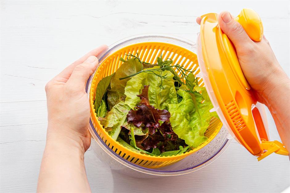 Salatschleudern sorgen zwar dafür, dass Ihr Salat perfekt sauber und trocken auf dem Teller landet, aber Sie können die Blätter ebenso gut einfach unter dem Wasserhahn waschen und anschließend trockentupfen. Dann bleibt auch der Abwasch aus. Außerdem sind Salatschleudern ziemlich sperrig und nehmen viel Platz im Küchenschrank ein.