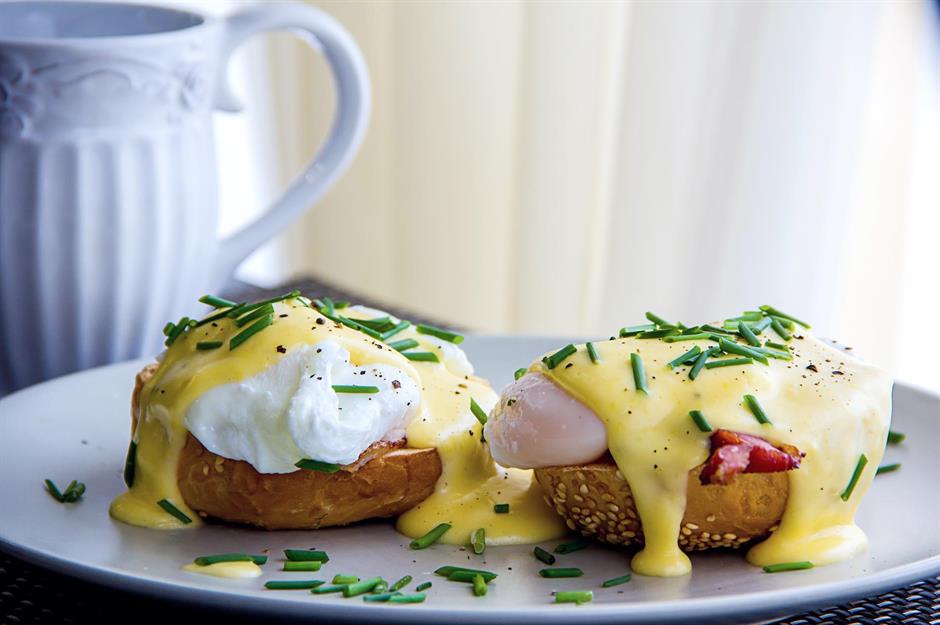 Una vez que hayas perfeccionado el escalfado de un huevo, es hora de crear este eterno favorito. Puedes comprar salsa holandesa decente ya preparada, así que es un plato rápido de montar. Sobre panecillos tostados y untados con mantequilla, añade una capa de bacon crujiente, jamón en lonchas o espinacas cocidas. Cubre con los huevos y la salsa caliente, ponlos bajo el grill durante un minuto o así para glasear un poco la salsa, y luego esparce cebollino picado por encima para servir. Si quieres hacer trampas, puedes hacer caso omiso de la tradición y poner huevos fritos por encima.
