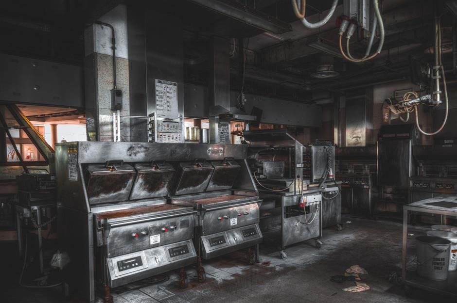 In der Küche verrotten moderne Geräte – vom Burgergrill über Warmhalteplatten bis hin zur Fritteuse – während von der Decke Kabel und Schläuche hängen. Der einst makellose Boden ist mit Fett und Schmutz bedeckt.