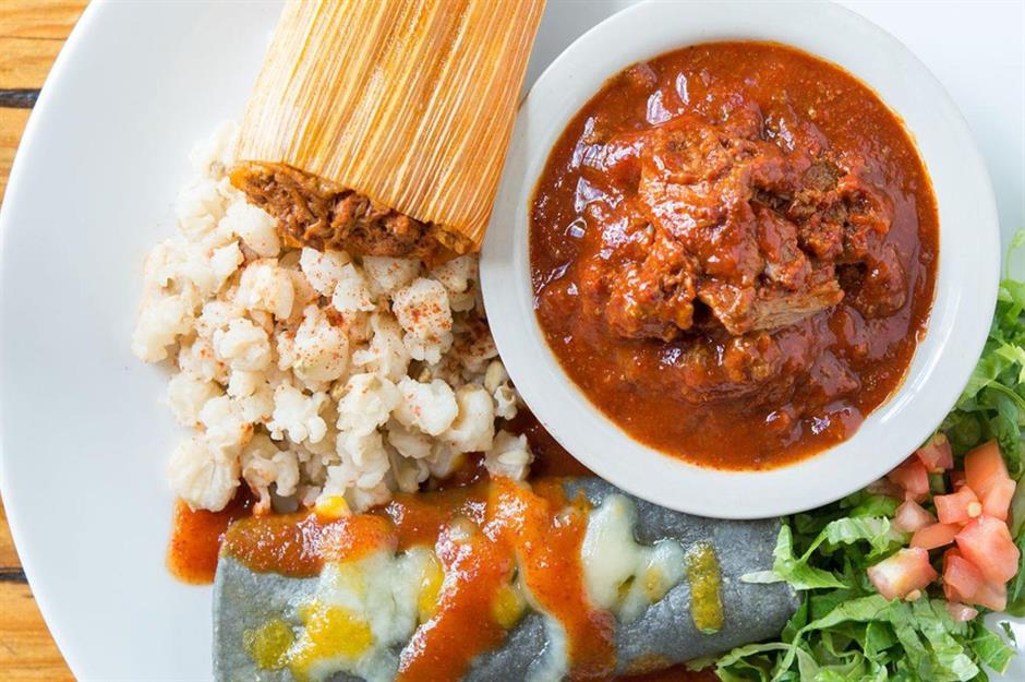 New Mexico’s answer to chili con carne, carne adovada is especially delicious. This chili style swaps the usual beef for chunks of pork and simmers the meat slowly with oregano, garlic, and sometimes cumin. It’s saucier than other types of chili and is often served with rice, flour tortillas, or roasted potatoes. Locals swear by the version at Rancho De Chimayó in Chimayó, an old-school spot that’s been serving up carne adovada since 1965.