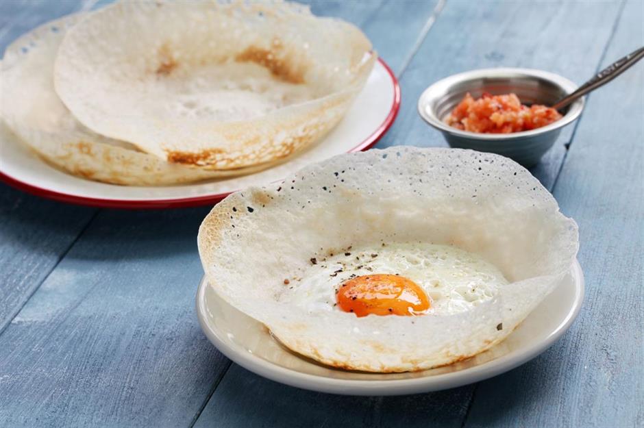 Diese hauchdünnen, knusprigen Pfannkuchen gehören zu den leckersten Frühstücksgerichten der Welt und sind nicht nur in Sri Lanka beliebt. Hoppers haben ihren Namen von der Pfanne, die ihnen ihre kuriose Form gibt. Die pfannkuchenartige Hülle wird aus Reismehl und Kokosmilch hergestellt. Es gibt sowohl süße als auch herzhafte Varianten, aber am häufigsten werden sie mit einem Ei im Teig zubereitet und mit Beilagen wie Chutney, Sambal (eine scharfe Würzsauce) oder cremigen Dahl serviert.