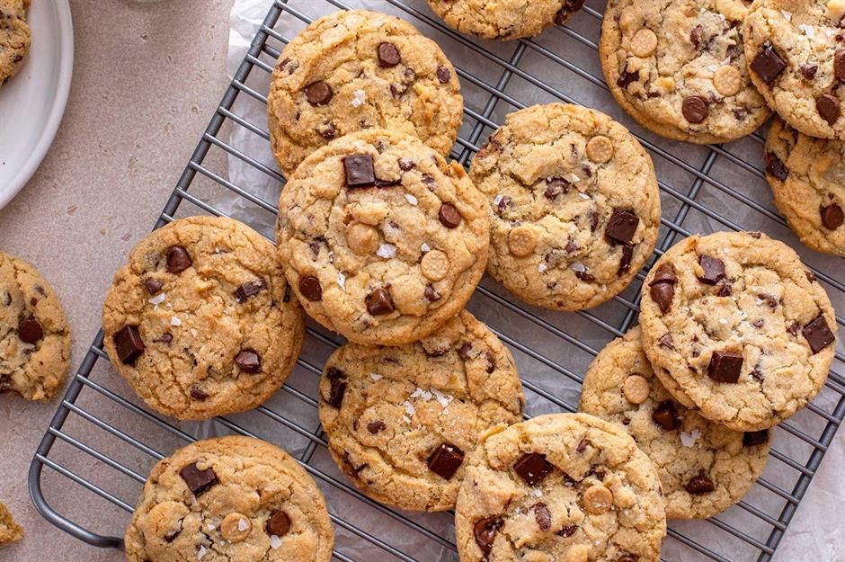 Vermengen Sie 125 Gramm ungesalzene Butter mit 100 Gramm braunem Zucker und 75 Gramm weißem Kristallzucker. Dann ein Ei, einen Teelöffel Vanillearoma, 300 Gramm Mehl, einen Esslöffel Speisestärke, je einen halben Teelöffel Natron und Meersalz und 300 Gramm Schokoladenstückchen untermischen.