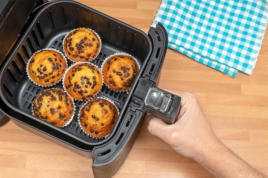 Heizen Sie zuerst die Heißluftfritteuse auf 160 Grad vor. In einer Schüssel 60 Milliliter Pflanzenöl, 75 Gramm Naturjoghurt, ein Ei, zwei Esslöffel Milch, 100 Gramm Zucker, 150 Gramm Mehl, zwei Teelöffel Backpulver und 75 Gramm Blaubeeren, Schokoladenstückchen oder Trockenfrüchte vermengen. Mit einem Löffel in sechs Silikonmuffinförmchen füllen und zwölf bis 15 Minuten backen.