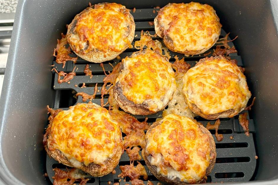 Legen Sie einfach eine Folie auf den Boden des Frittierkorbs, um den geschmolzenen Käse aufzufangen. Mit unserem Rezept erhalten Sie vier köstliche gefüllte Portobello-Champignons.