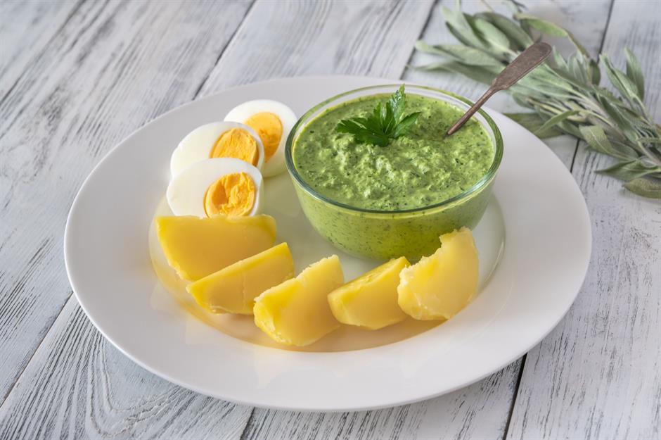 Diese würzige Suppe, regional auch als „Frankfurter Grüne Soße“ bekannt, wird aus neun frischen Wildkräutern zubereitet und traditionell zum Gründonnerstag genossen – wobei der Ursprung vermutlich sogar noch älter als das Christentum ist und auf die Kelten und Germanen zurückgeht. Verwendet werden können zum Beispiel Brennnessel, Bärlauch, Giersch, Spitzwegerich, Sauerampfer, Gundermann, Borretsch, Knoblauchrauke und sogar Gänseblümchen.