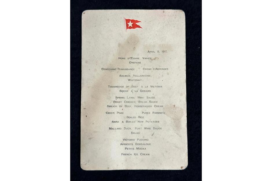 Dieses Dokument, das wahrscheinlich die einzige noch erhaltene Speisekarte für das Abendessen der ersten Klasse vom 11. April 1912 – drei Tage vor der Tragödie – ist, wurde am 11. November 2023 über Henry Aldridge & Son im englischen Wiltshire versteigert. Das Schriftstück enthält leichte Wasserschäden und wurde vom Auktionshaus als „eine bemerkenswerte Reliquie des berühmtesten Ozeandampfers aller Zeiten“ beschrieben.