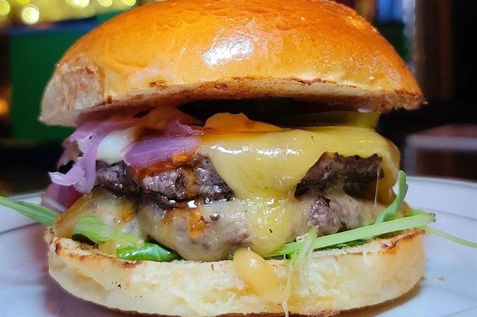 At the top end of the scale in terms of both price and ingredients, the Loyalist OG Cheeseburger has earned a serious reputation in gourmet burger circles. A thing of simple beauty, it’s a must-order at Chicago’s smart-casual spot The Loyalist. Made with a richly fatty blend of chuck, short rib, and bacon, the thick patty delivers an umami punch, while the toasted sesame bun adds nuttiness and texture. Add melted American cheese, crunchy cucumber pickles, and a generous helping of onions (pickled, charred, and mixed into mayo), and it’s no wonder this burger has amassed a loyal fan base.