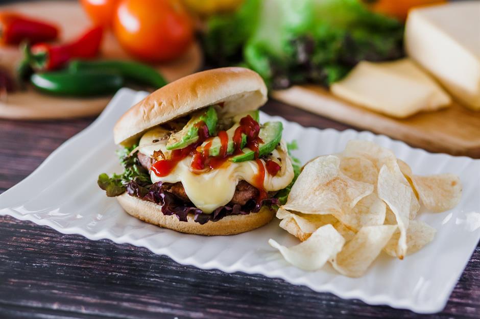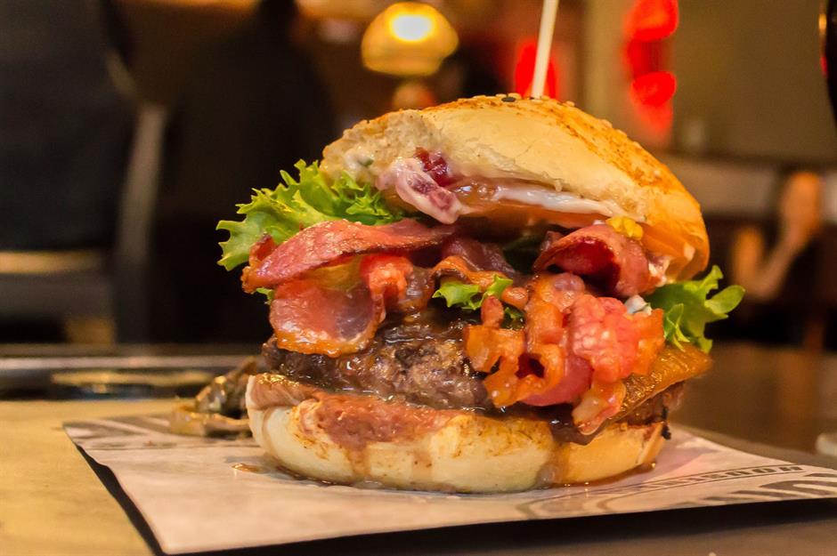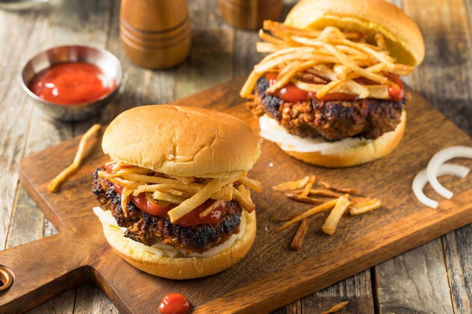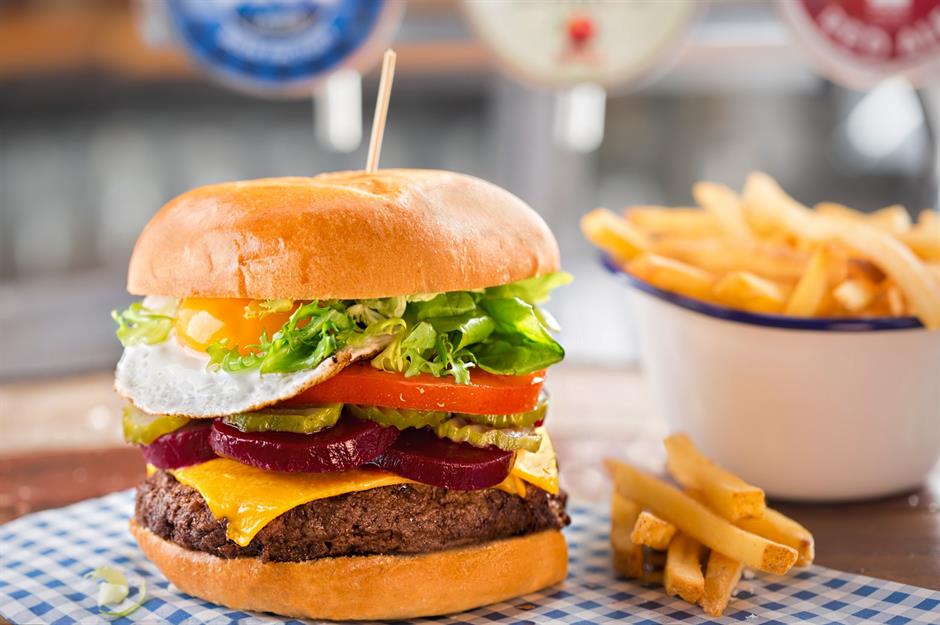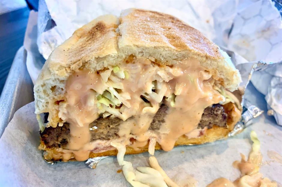 The Kiwi burger takes its name from the people of New Zealand, who developed their own take on the classic dish using favourite local flavours. A thick beef patty is stacked with earthy beetroot (a major crop in the country) and crowned with a fried egg, its golden yolk spilling into the bun. It closely resembles the Australian burger, which also features canned beetroot but often adds a sweet slice of pineapple for contrast.
