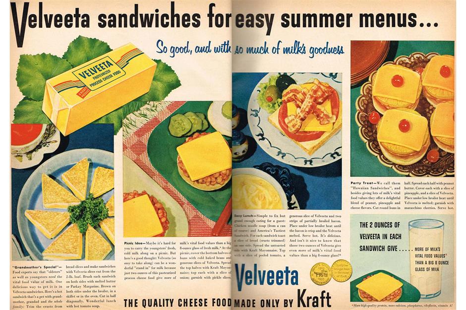 If you find the British penchant for beans on toast horrifying, take a look at this. This suspect sandwich appeared in a 1953 magazine advertisement from American Kraft cheese brand Velveeta – it was suggested that the baked bean, cheese and mayonnaise combination was the perfect picnic food. Velveeta cheese was used to top cold baked beans on a bun, which was then garnished with raw onion, pickles and mayonnaise.