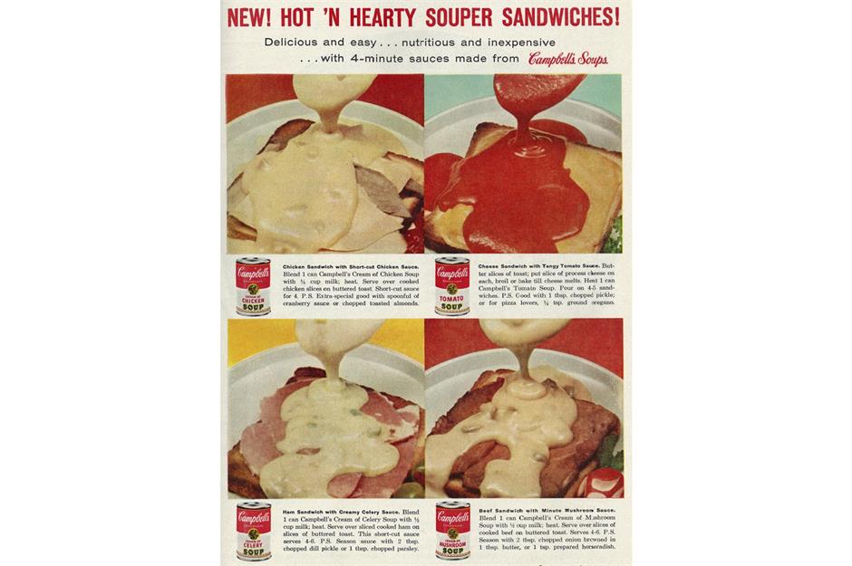 A steaming bowl of soup and a sandwich make a hearty and comforting meal. But topping bread with soup and calling it a sandwich, as suggested by Campbell’s in the 1950s, is an unsettling twist on a classic. Campbell’s offered some different pairing options, trying to convince people that tomato soup on a cheese sandwich (or cream of celery on a ham sandwich) could be the next big thing, but we’re not convinced by what sounds like a soggy mess.