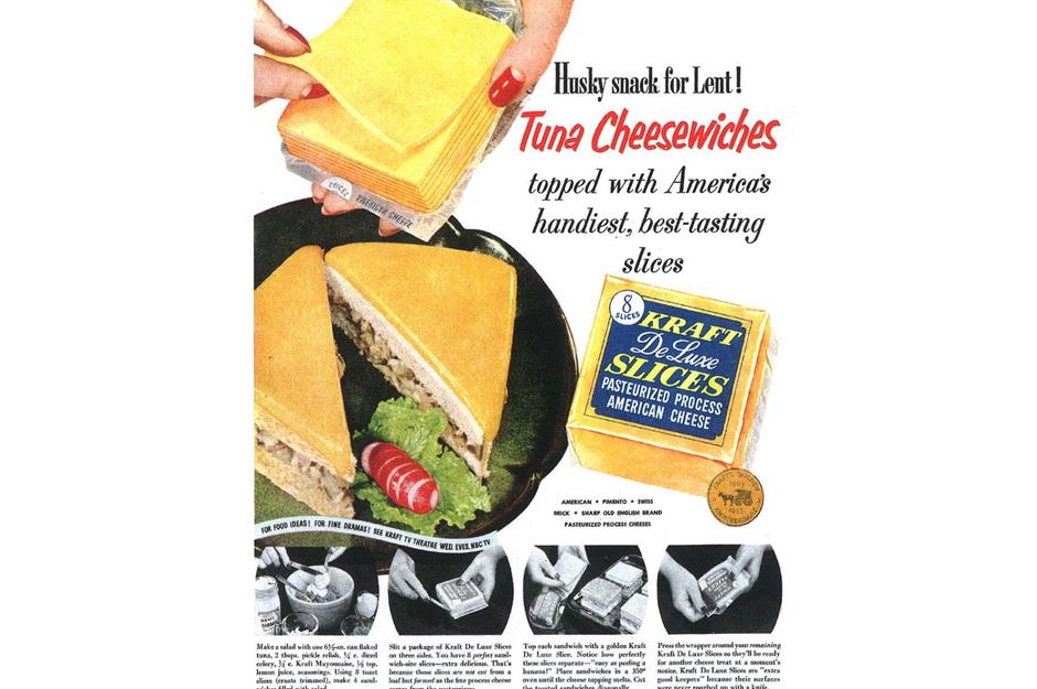 Tuna and cheese are no strangers to each other – tuna melts are a classic for a reason. This especially cheesy 1953 twist from Kraft is a little harder to get on board with, though. It sees mayonnaise and tuna spread between two slices of toast, then topped with single slices of cheese and baked until super melty. While there’s nothing wrong with the flavours, the resulting molten mess doesn’t exactly sound easy to eat, especially without a knife and fork.