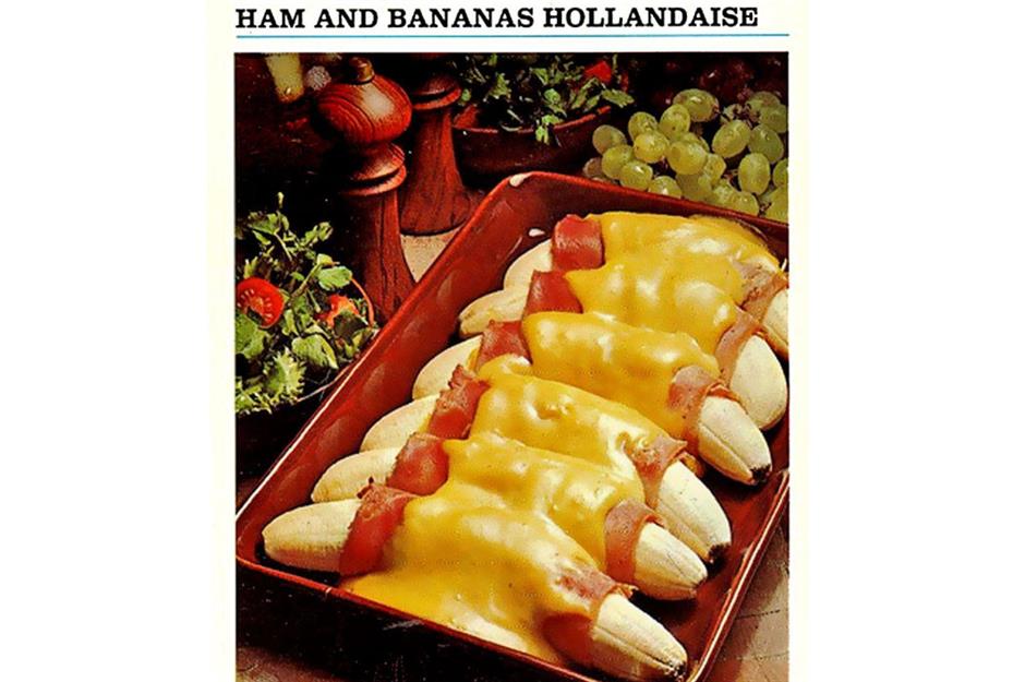 You might have heard of the infamous banana and ham Hollandaise, a 1973 recipe from McCall’s Great American Recipe Card Collection. This sandwich plays on the odd combination by turning similar ingredients into a filling by mashing banana with minced ham and spreading it on buttered bread. Suggested variations, from 1001 Sandwiches by Florence A. Cowle, include sautéing thin slices of banana and placing them on hot buttered toast with devilled ham, then heating it all under the grill.