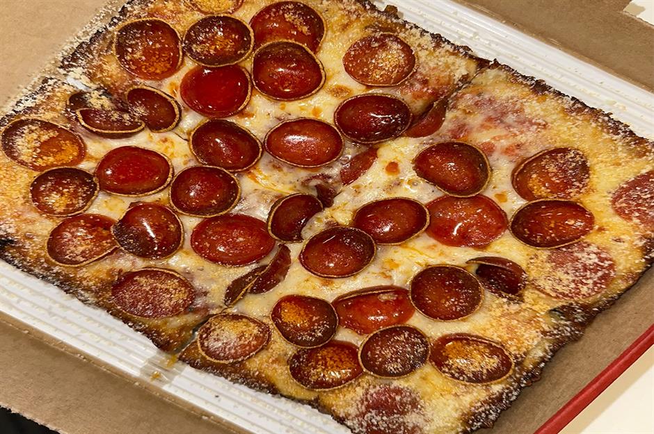 For a full-on Detroit pie experience, Jet’s is a must. Founded in Sterling Heights, Michigan in 1978 and famous for its thick, crisp-edged pizzas, Jet’s Pizza is now found in 22 states with multiple outlets in each. Despite its exponential growth, the quality has stayed the course. Go for the signature corner pizza to wrap your mouth around one of its cheesy-to-the-edge crusts. The dough, made in-store daily and baked in Jet’s customized Detroit-made steel pizza pans, is golden and crispy on the outside and spongy on the inside.