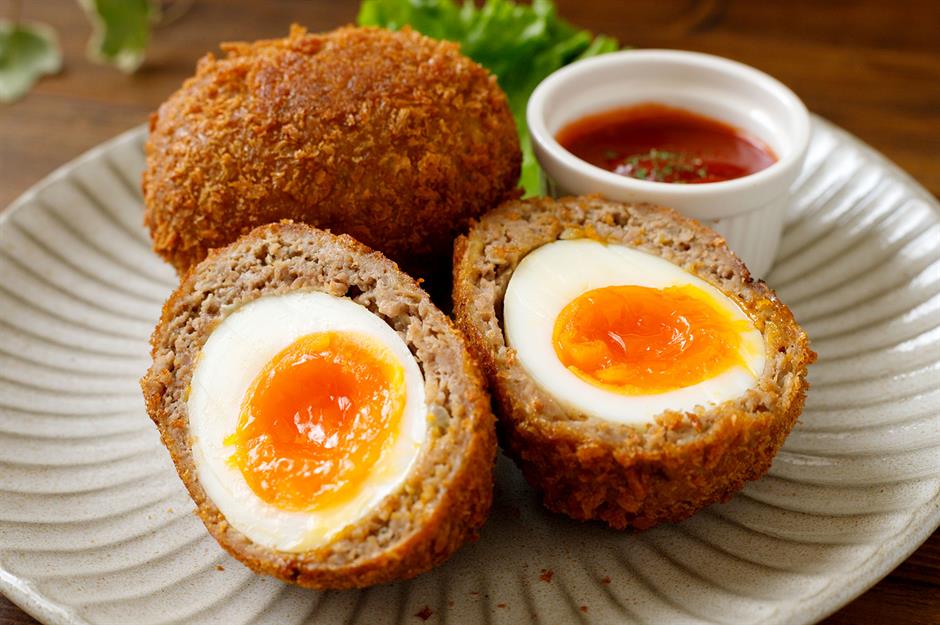 You might assume Scotch eggs were born in Scotland, but they’re actually a classic English snack. In the 19th century, eggs were ‘scotched’ – a process used to preserve them and make them less smelly and more appealing. At some point, someone had the genius idea to wrap these eggs in sausage meat, coat them in breadcrumbs and deep fry them to crispy perfection. Today, you’ll find fancy versions with a gooey, runny yolk inside; however, traditionally, hard-boiled eggs are the standard.