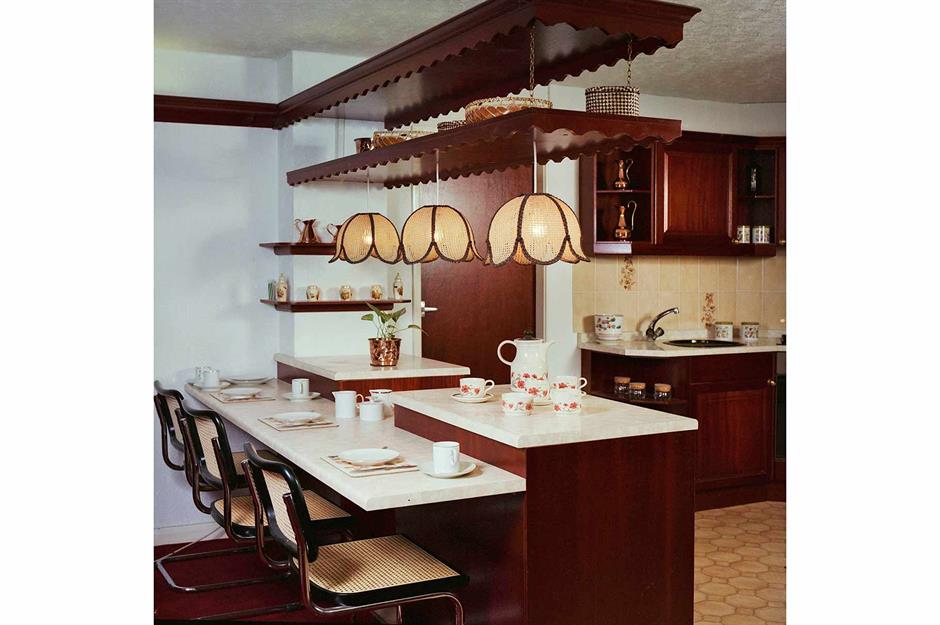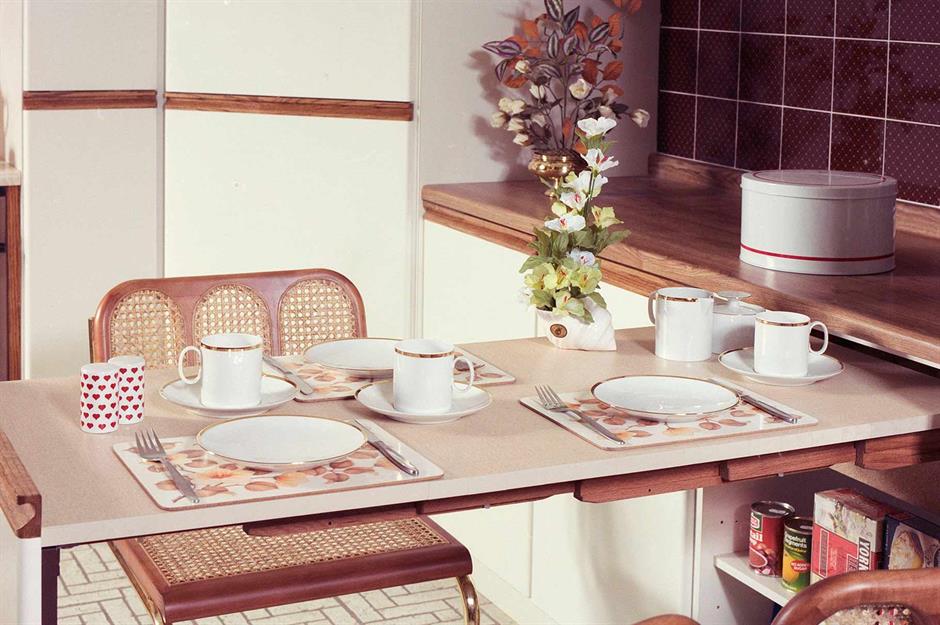 During the economic boom of the 1980s, many people had more disposable income, but house sizes – particularly in new builds – were shrinking. Architects and interior designers had to find clever ways to fit more features into smaller spaces, making foldaway breakfast bars a smart solution for kitchens where there wasn’t room for a full table and chairs. The end of the table features a false door front, allowing it to blend seamlessly into the row of cabinets when not in use.