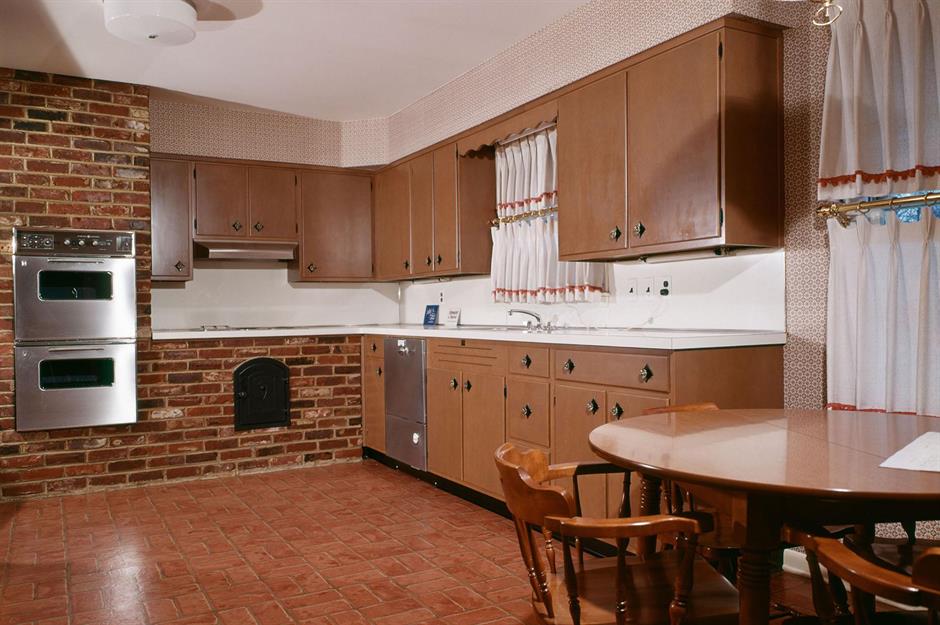 This 1987 photo shows actor Carrie Fisher in her Bel Air home. Her rustic country-style kitchen showcases several top 1980s trends, from the hand-stencilled ivy pattern on the ceiling to the dried corn husks and pot rack. The impressively large range cooker and top-of-the-line blender would have been highly sought after by serious cooks. The humorous sign above the stove? Not so much.