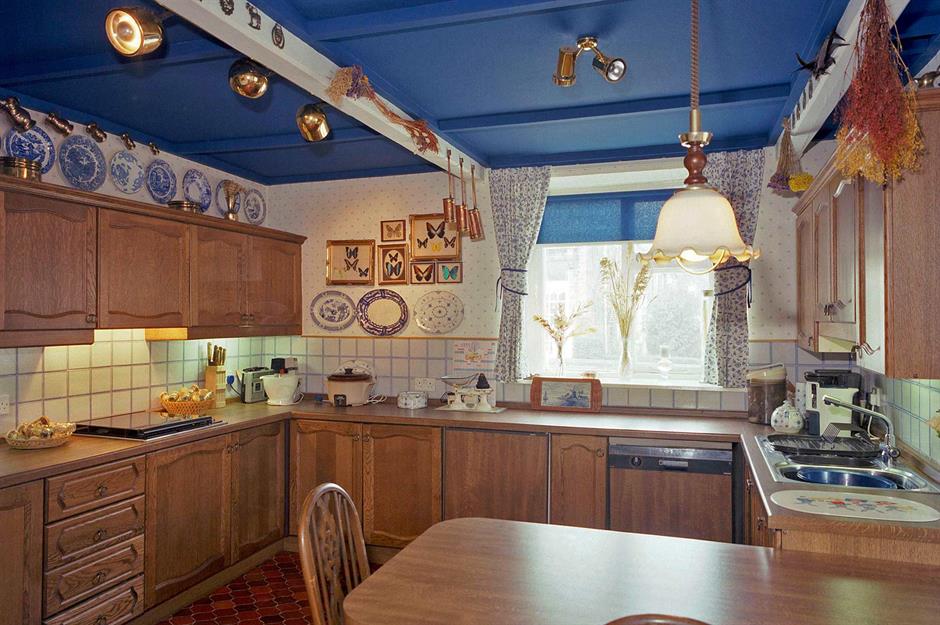 These days, you're more likely to find a range of tones in any given room. However, in the 1980s, a two-colour scheme was very common. The blue and white theme in this country kitchen was likely inspired by the decorative plates displayed above the cabinets, and it's been faithfully carried through to the tiles and grout, the floral curtains and even the statement ceiling and painted beams.