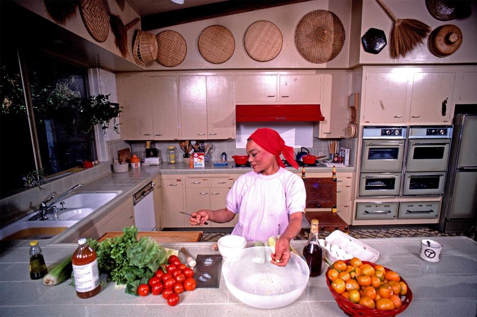 This photo shows American singer and actor Eartha Kitt in the kitchen of her Hollywood home in 1982. She opted for a neutral palette throughout, from the beige cabinets to the stack of integrated ovens, grill and warming drawers. Tiled countertops were a popular choice in the 1980s, but Kitt's unique sense of style really shines through in the row of straw baskets and brushes arranged at ceiling height.